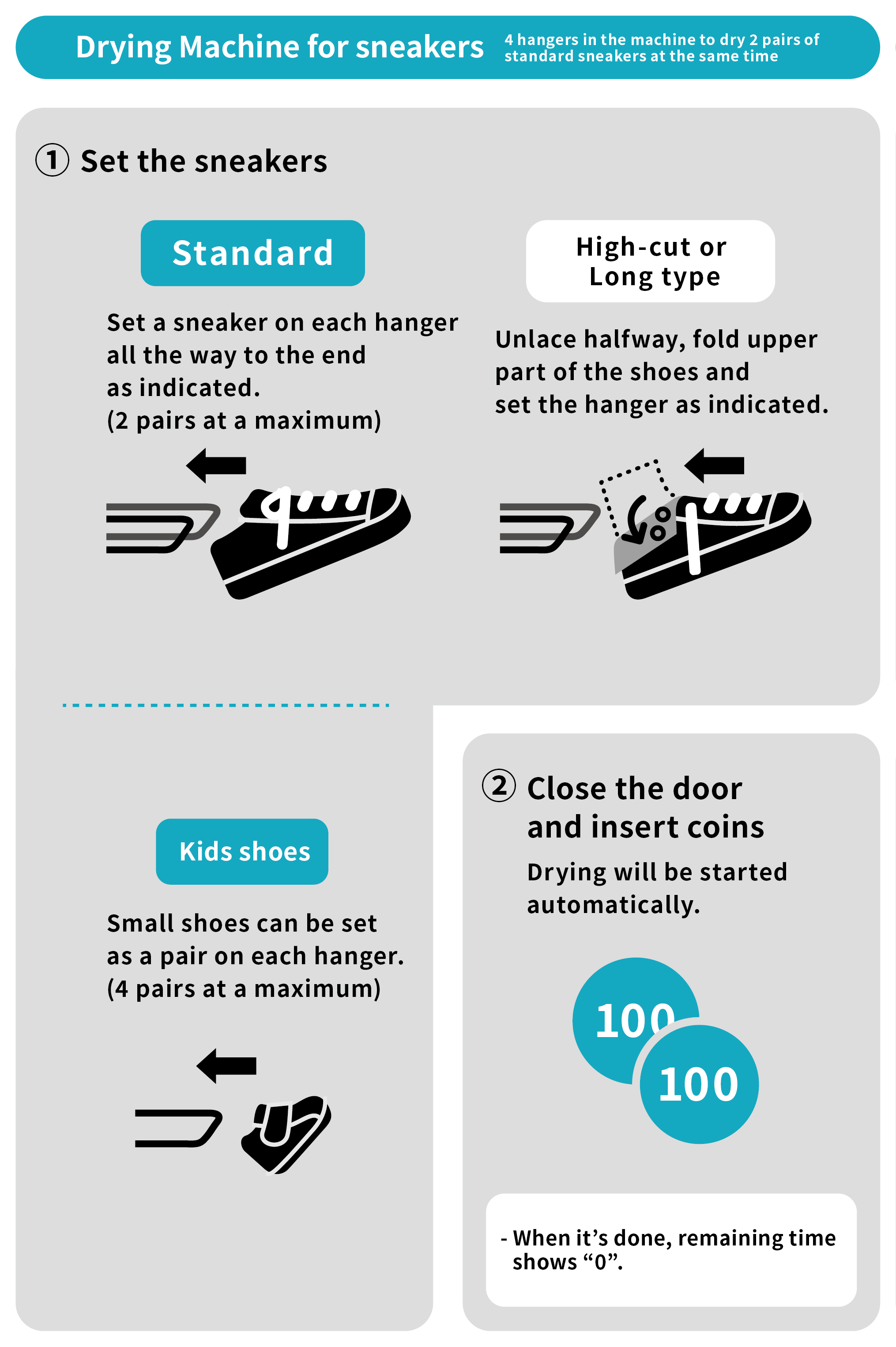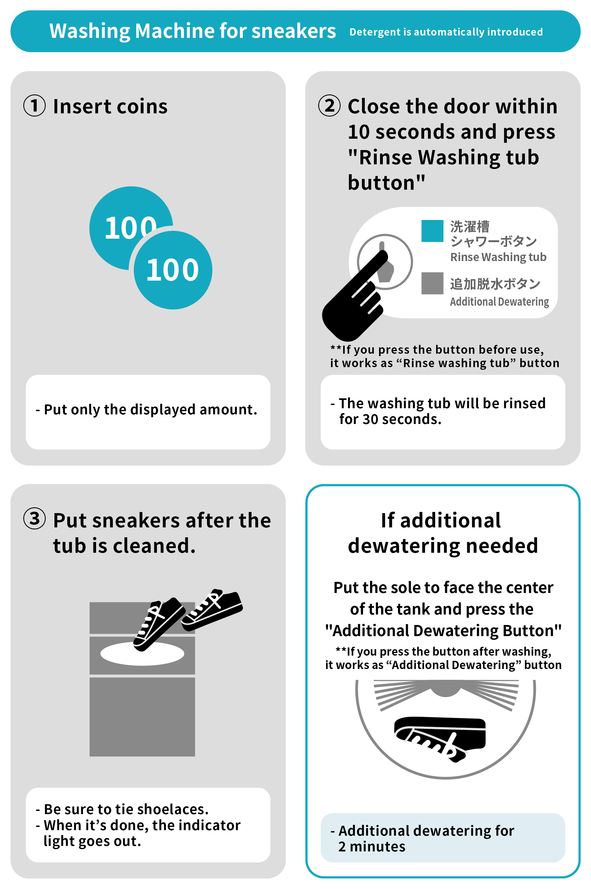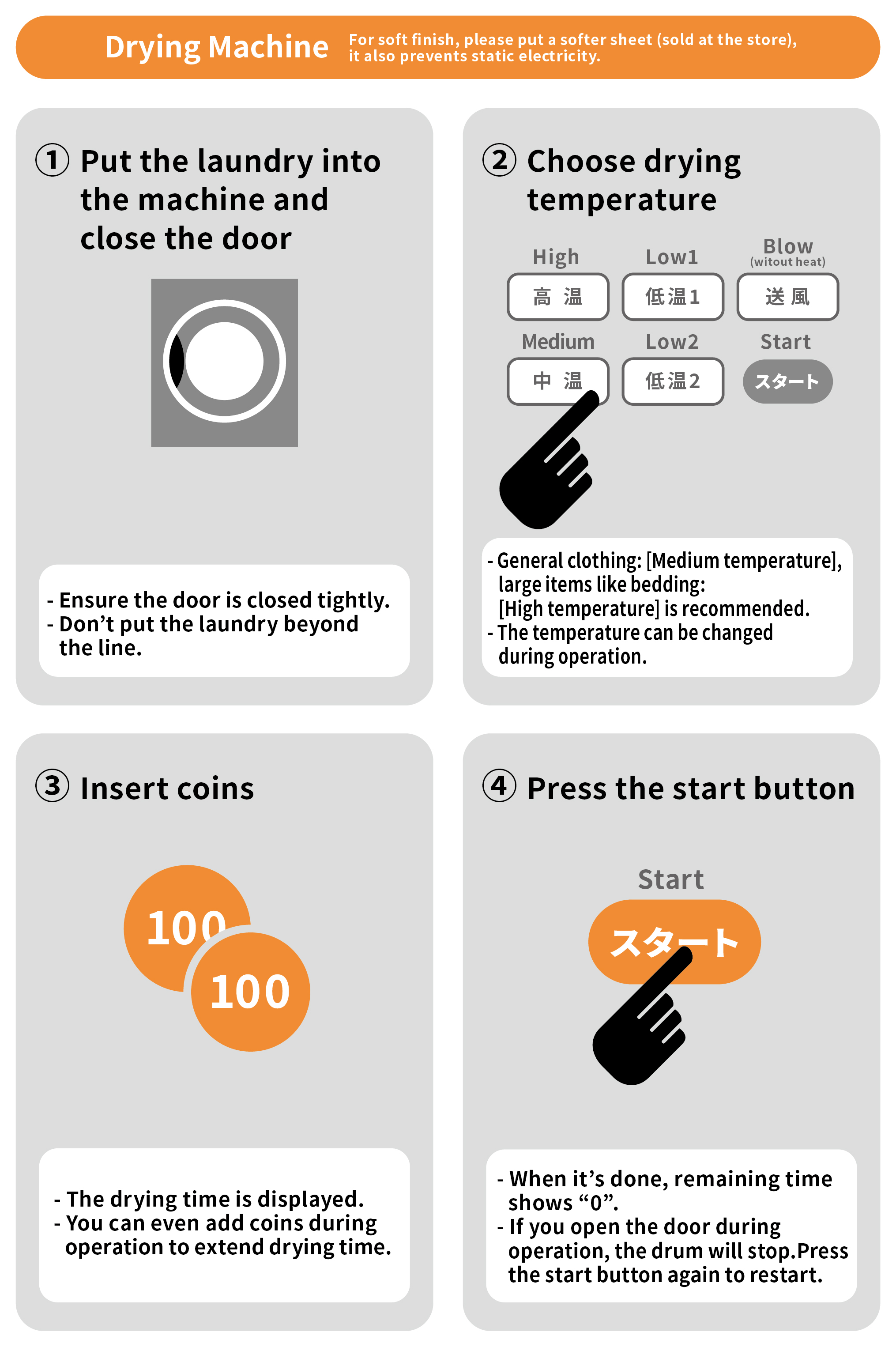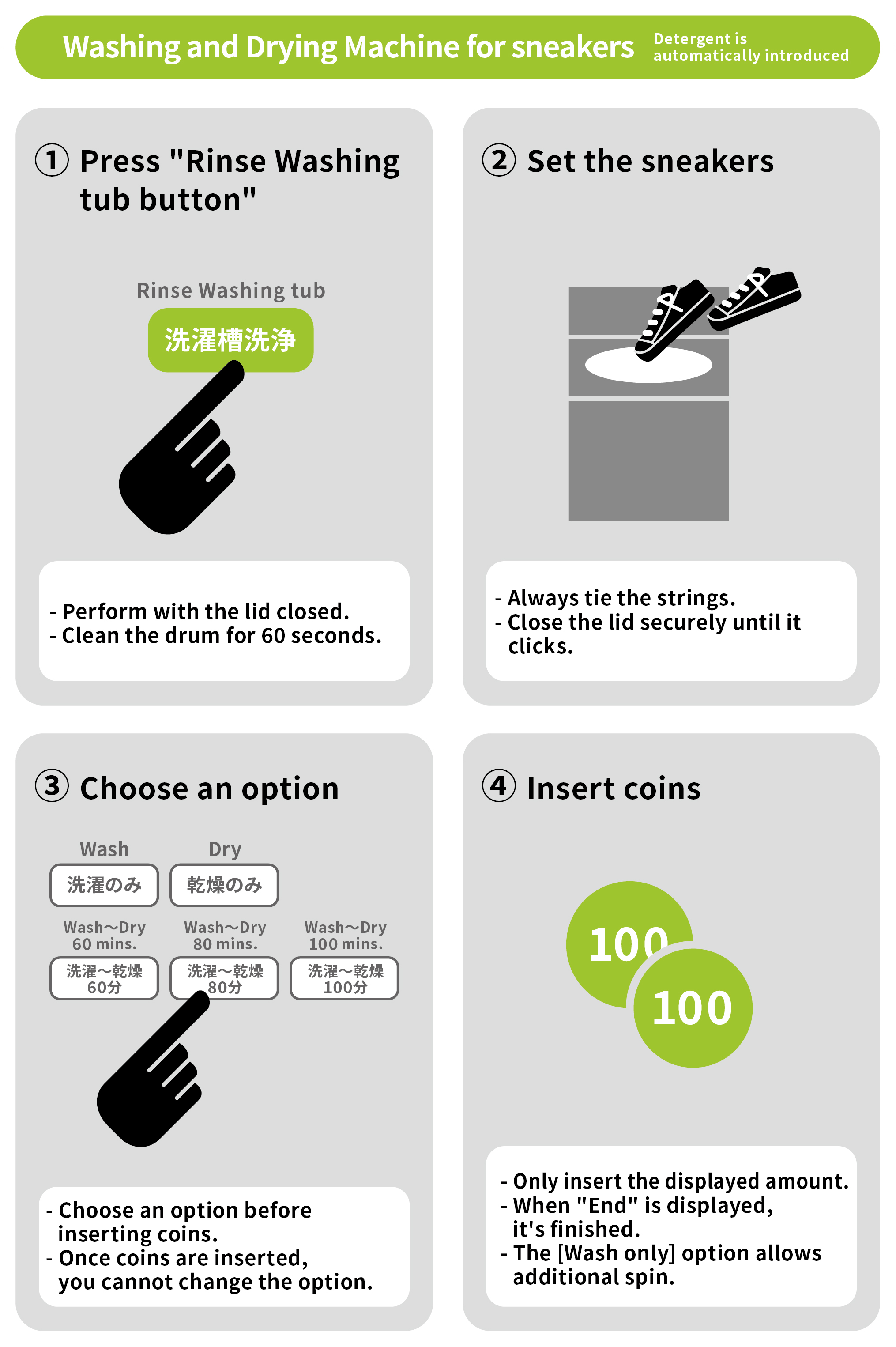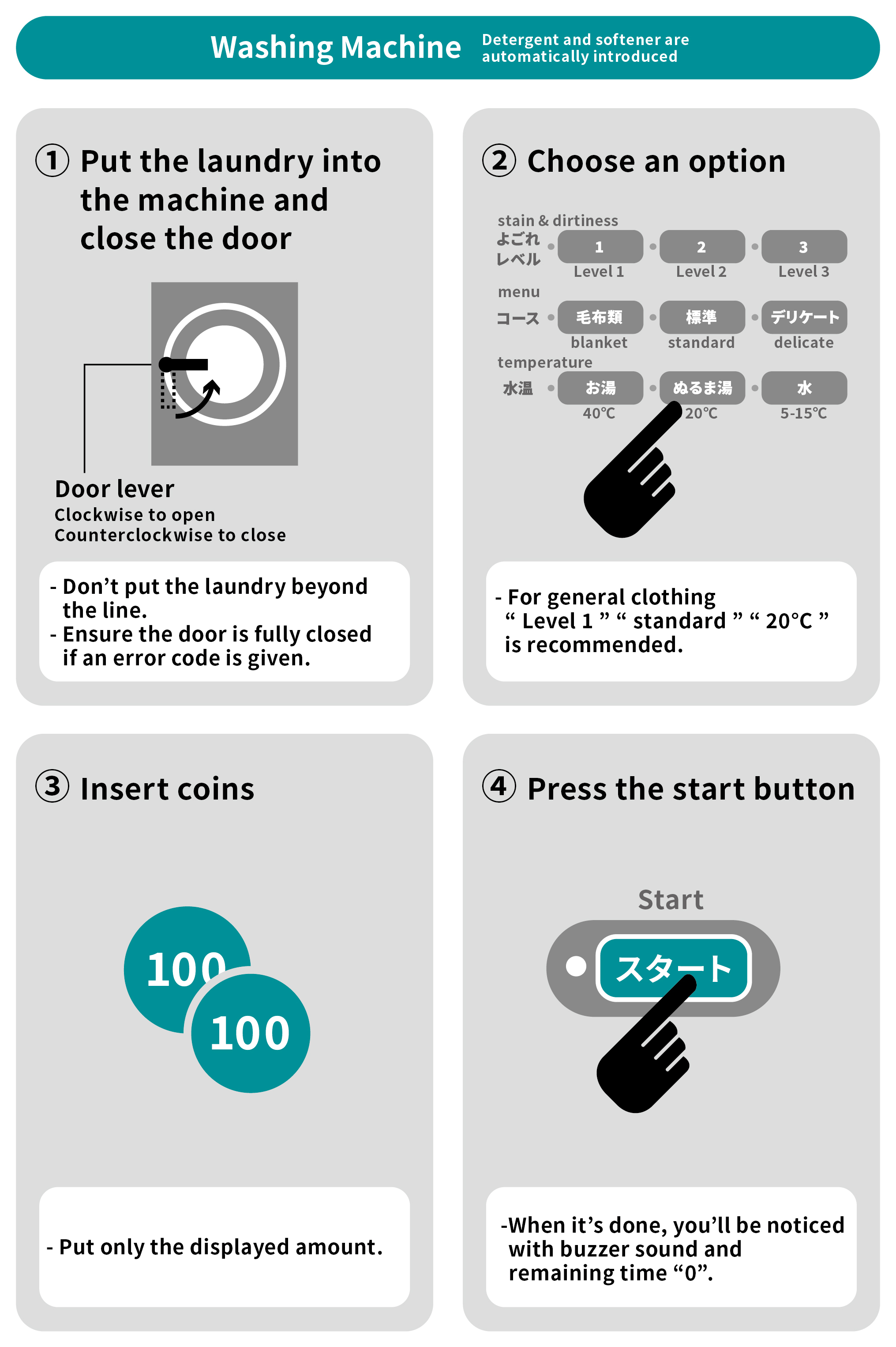 - 機器類停止後は速やかに洗濯品の取り出し、移動を行ってください。残置された洗濯品は第三者にて取り出し、移動をする場合がありますので予めご了承ください。